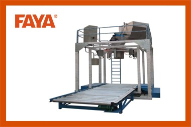 将吨包装袋套在加料嘴上,将包装袋四角挂在气缸上,按动“允加”按钮,这时压袋气缸开始工作并压住袋口,气缸将包装袋四角撑开,控制器将包装袋重量自动去除,螺旋转动迅速将物料灌装入袋中,振动台开始振动将物料振实,随袋中空气一起溢出的粉尘通过吸尘器由除尘器吸走,待加料快到设定值时,螺旋转速减速慢加,振动停止,到设定值时,加料停止。误差<0.3%。这时压袋气缸松开袋口,气缸将包装袋四角松开,铲车将包装袋送出。